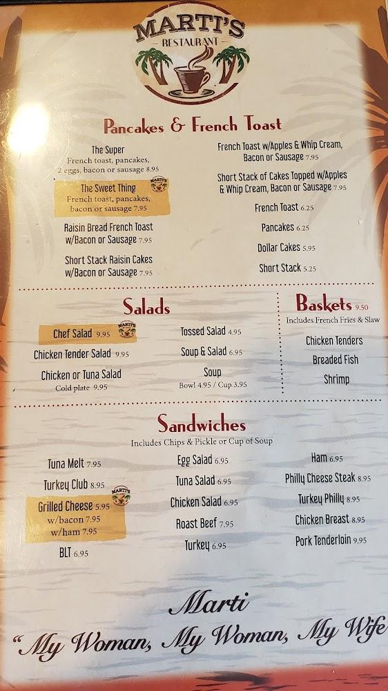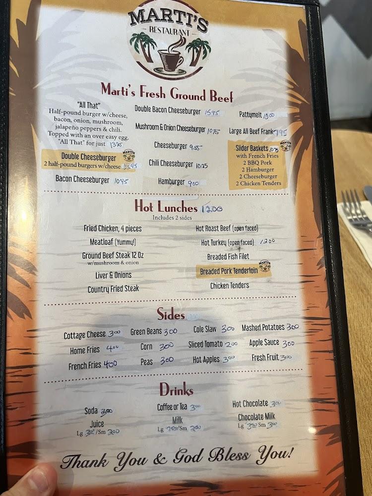 The menu at Marti's Family Dining features classic American dishes. Breakfast is a highlight, with options like fluffy pancakes and hearty omelets. Lunch and dinner offer sandwiches, salads, and classic comfort foods like chicken fried steak and meatloaf. Prices are wallet-friendly, averaging around $10. The emphasis is on simple, homestyle cooking. Kid-friendly options ensure that families find something for everyone. Specialty items, like the famous biscuits and gravy, keep diners returning. Desserts also provide the sweet finish to meals, enhancing the overall dining experience.